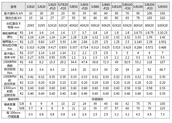2,持續(xù)負(fù)載率(工作制)為10分鐘內(nèi)工作的百分比,SJT/SKT梯形絲杠螺旋升降機(jī)的工作制為30%,SJB/SKB滾珠絲杠升降機(jī)的工作制為50%,當(dāng)負(fù)載率小于100%時(shí)根據(jù)實(shí)際情況可以提高持續(xù)負(fù)載時(shí)間。